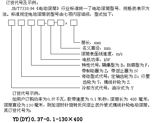 (2)用戶訂購逆止電動(dòng)滾筒時(shí),須注明旋轉(zhuǎn)方向,如不注明則為任意方向。其表示方法為在特性代號(hào)后加“S”(表示在電機(jī)引出線一側(cè)觀察,端蓋應(yīng)順時(shí)針旋轉(zhuǎn))或“N”(表示在電機(jī)引出線一側(cè)觀察,端蓋應(yīng)逆時(shí)針旋轉(zhuǎn))。